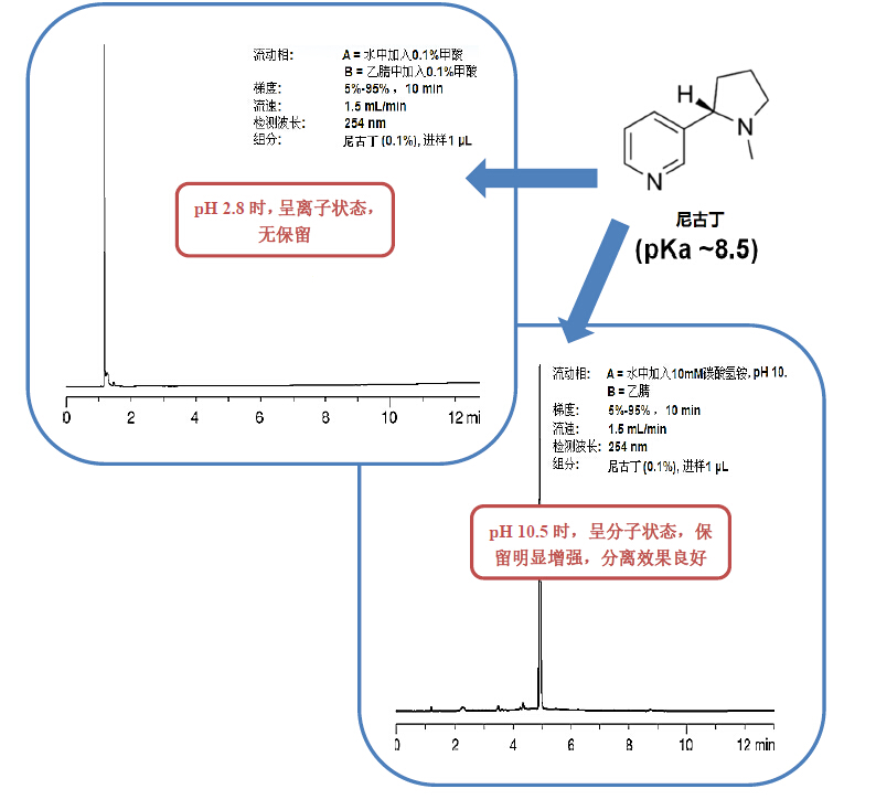 而電離的化合物具有極性化合物的行為,這減小了與固定相之間的疏水相互作用,導(dǎo)致保留降低。