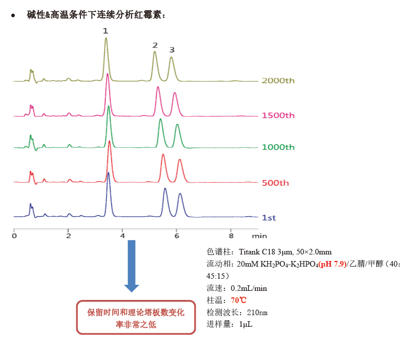 例如紅霉素,它在酸性條件下極易分解,并且需要高溫來維持良好的峰形,普通硅膠基質(zhì)色譜柱是難以耐受這種分析環(huán)境,這時,就需要 Titank系列有機(jī)硅膠雜化色譜柱來解決上述分析難題。