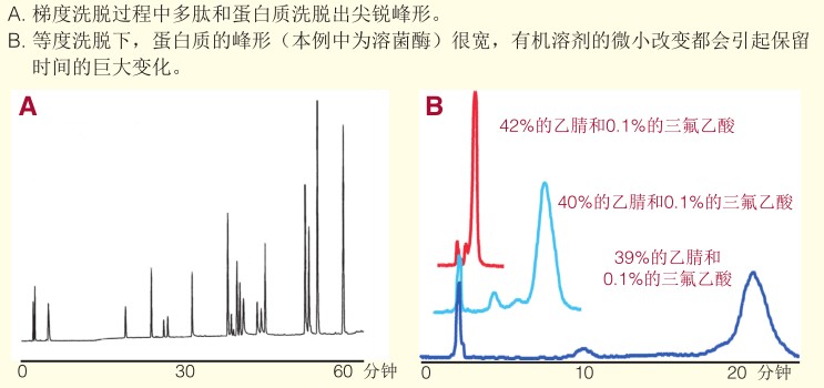 在RP-HPLC中,蛋白和多肽的保留和一般的小分子化合物有所不同,等度洗脫對于蛋白質(zhì)的分離作用很小,有機(jī)相比例小的變化會引起蛋白質(zhì)保留的大的變化。