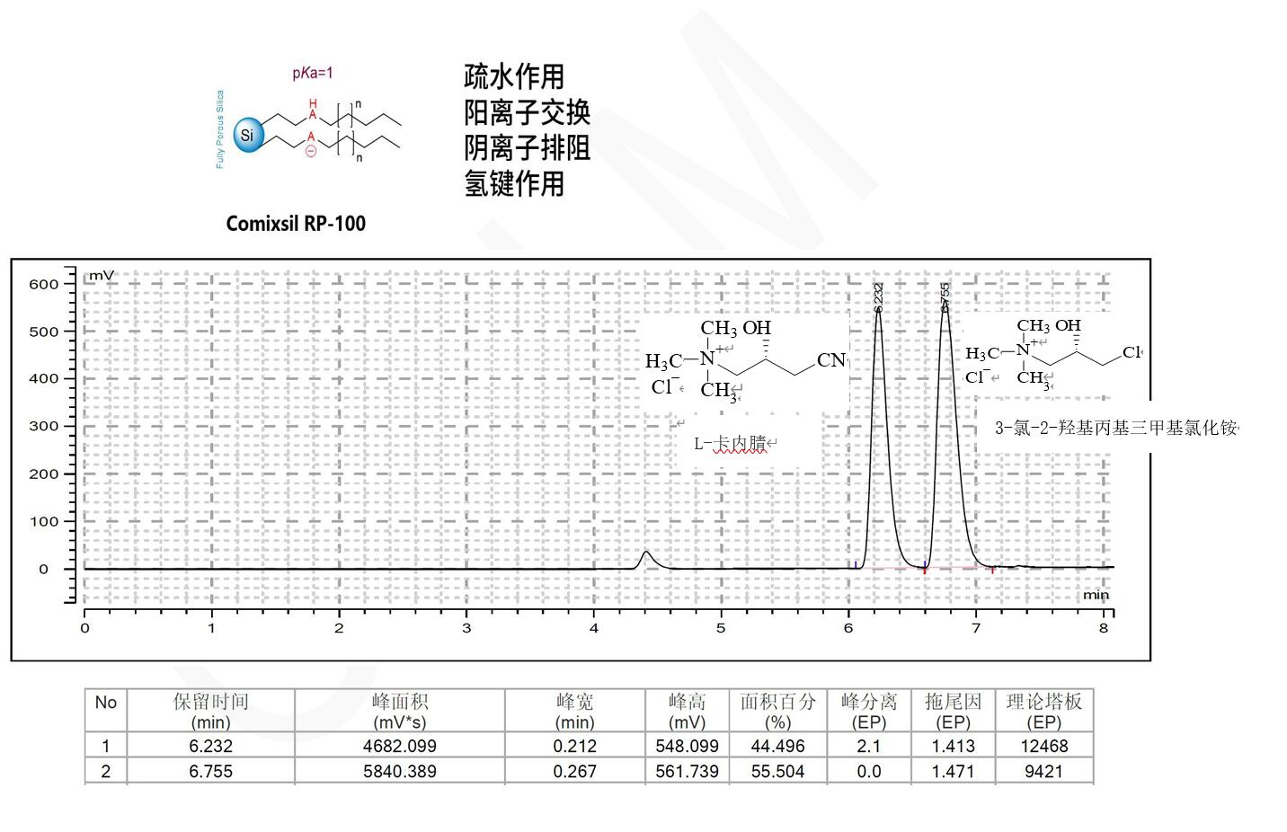 Comixsil RP-100 混合模式對 L-卡內(nèi)腈和 3-氯-2-羥基丙基三甲基氯化銨的分析