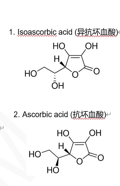 抗壞血酸與異抗壞血酸是一對光學(xué)異構(gòu)體??箟难崾且环N營養(yǎng)強(qiáng)化劑,藥用為多。異抗壞血酸,多用于食品與化妝品中,作為防腐劑用。