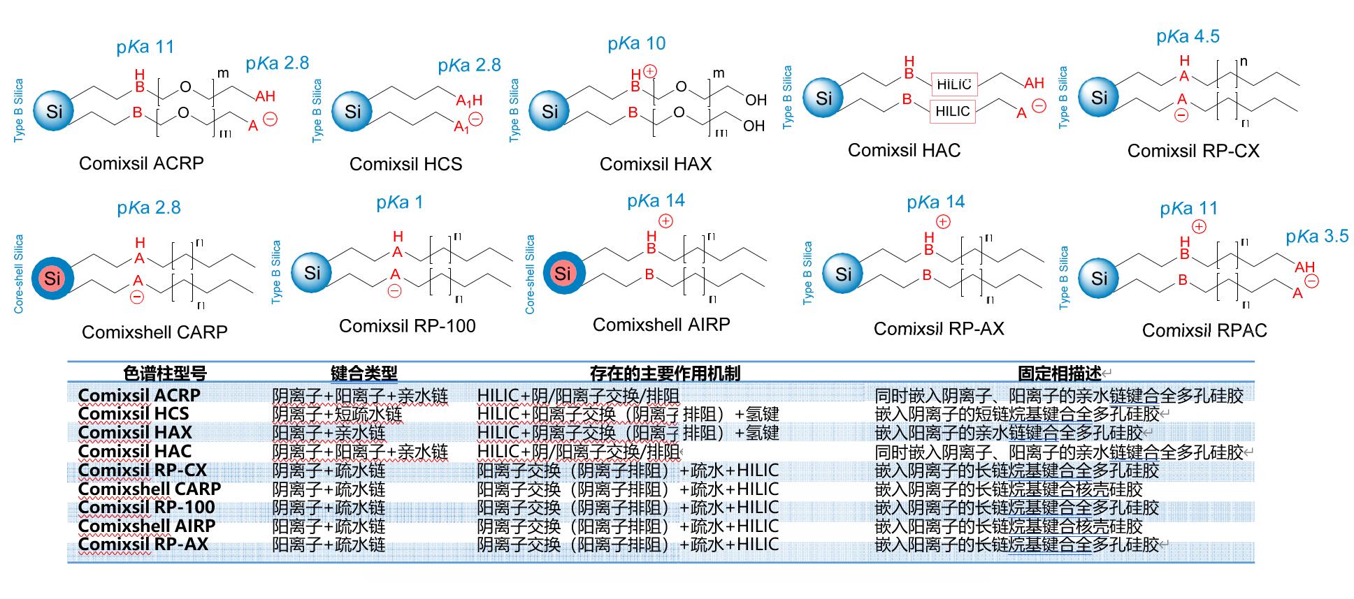 菲羅門公司的Comix系列為創(chuàng)新的混合作用(Mixed-mode)液相色譜柱,通過(guò)在疏水的碳鏈或者親水鏈上嵌入離子基團(tuán),可以實(shí)現(xiàn)在不同的流動(dòng)相條件下提供離子交換/排阻、Hilic和疏水等作用,可以為大極性化合物和成分之間性質(zhì)差異大的樣品的分析提供新的解決方案。以下為具體固定相信息: