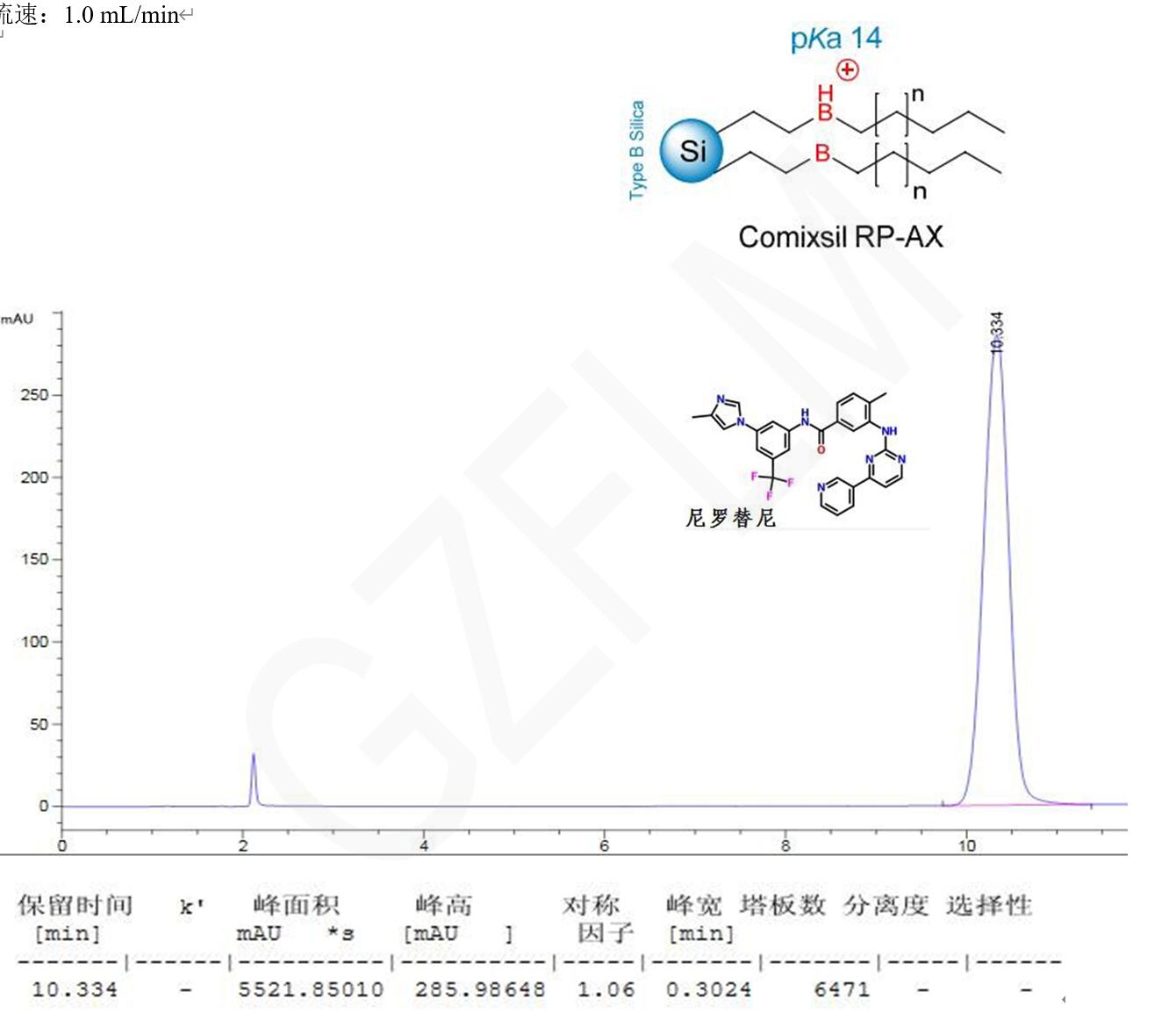 方法說明:尼羅替尼具有多個(gè)堿性基團(tuán),在 C18 柱上會(huì)出現(xiàn)明顯拖尾效應(yīng);而使用 Comixsil RP-AX 是陰離子交換+疏水混合模式,對化合物上堿性基團(tuán)是排斥作用,可以達(dá)到改善峰型的效果。