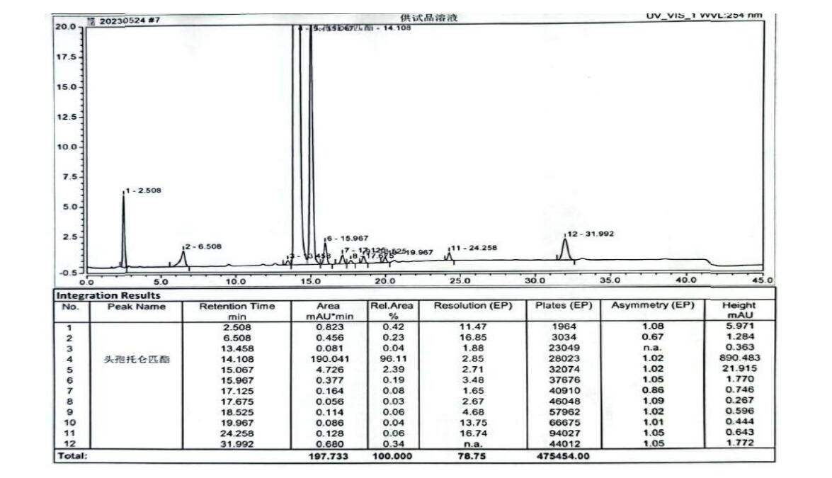 頭孢妥侖匹酯顆粒的檢測限為20 μg/ml,線性范圍為20-400 μg/ml,RSD不超過2%。該方法簡便、準確、靈敏度高,可以用于頭孢妥侖匹酯顆粒的質量控制和分析。