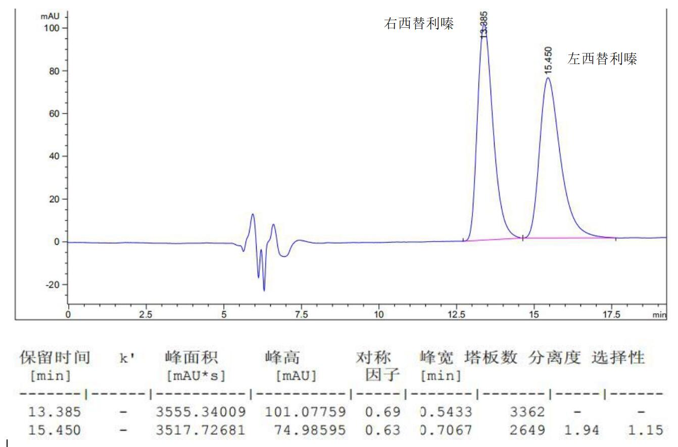 方法說明:根據(jù)標(biāo)準(zhǔn)要求,出峰順序依次為右西替利嗪與左西替利嗪,左西替利嗪拖尾因子不大于 2.0,右西替利嗪與左西替利嗪分離度應(yīng)大于 1.4,使用 Chiral NS(2)-RH 進(jìn)行分析可滿足標(biāo)準(zhǔn)要求。