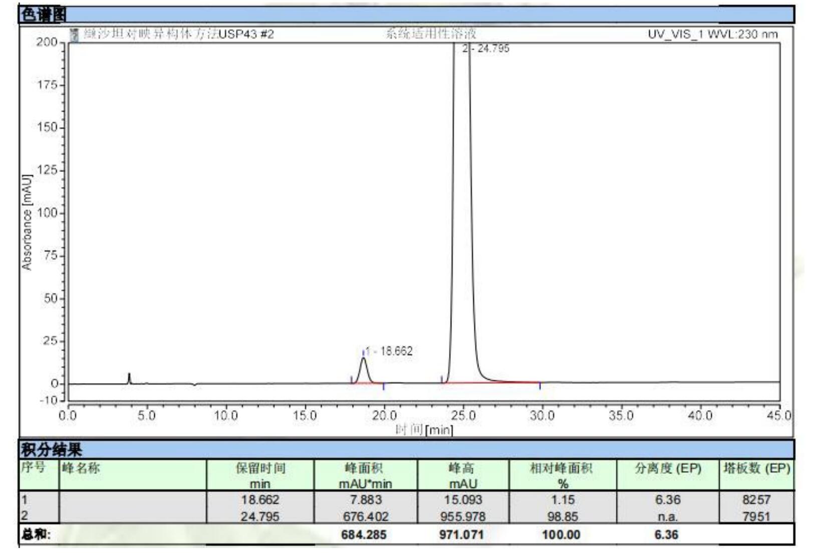 App ID: FLM-B230018 纈沙坦對映異構(gòu)體的手性拆分 方法:USP 方法 色譜柱:Chiral INC 5u 250*4.6mm(貨號:FMG-JY5-I03) 檢測:UV 230nm 流動相:正己烷:異丙醇:三氟乙酸=850:150:1 流速:0.8ml/min 進樣體積:10μl 柱溫:室溫 圖譜: ![]() |