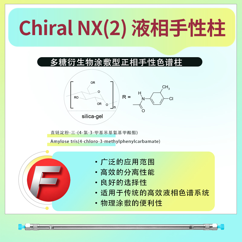 菲羅門Chiral NX(2)液相手性色譜柱采用直鏈淀粉-三-(4-氯-3-甲基苯基氨基甲酸酯)(Amylose tris(4-chloro-3-methylphenylcarbamate))作為固定相,這是一種多糖衍生物,能夠提供優(yōu)異的手性識(shí)別能力。該色譜柱適用于正相液相色譜(NP-HPLC)以及超臨界流體色譜(SFC)分離模式,為手性化合物的分離提供了廣泛的選擇。