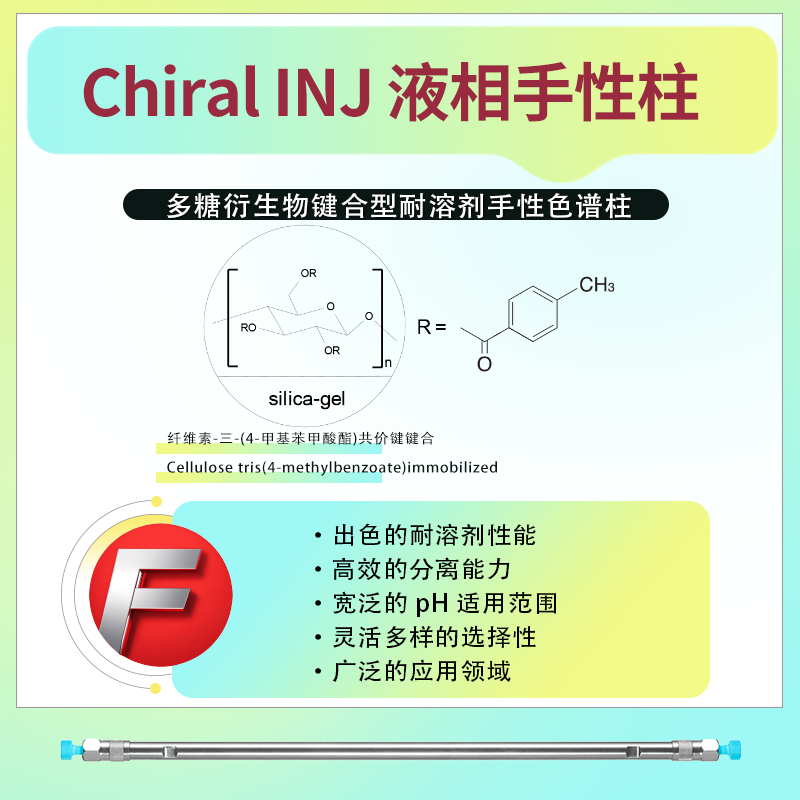 Chiral INJ 鍵合型耐溶劑手性柱 一、固定相與特性 Chiral INJ 鍵合型耐溶劑手性柱的固定相為纖維素-三-(4-甲基苯甲酸酯)共價(jià)鍵鍵合(Cellulose tris(4-methylbenzoate)immobilized)。這種設(shè)計(jì)使得該手性柱具有出色的手性識別能力和耐溶劑性,能夠在廣泛的溶解條件下使用,包括各種互溶的溶劑作為流動(dòng)相、溶解樣品以及手性柱再生。 二、使用條件 壓力:為了延長手性柱的使用壽命,建議保持壓力在30MPa以下。這有助于減少色譜柱的磨損和性能下降。 pH值:該手性柱適用于pH值范圍在2.0至9.0之間的溶液。這提供了廣泛的適用性,適用于多種實(shí)驗(yàn)條件。 溫度:建議在0℃至40℃的溫度范圍內(nèi)使用,以確保色譜柱的穩(wěn)定性和分離效果。 三、可使用的溶劑 Chiral INJ 鍵合型耐溶劑手性柱可使用多種溶劑,包括: 正相溶劑:如n-Hexane(正己烷)、IPA(異丙醇)、EtOH(乙醇)等。 特殊流動(dòng)相:如Ethyl acetate(乙酸乙酯)、CH3Cl(氯仿)、THF(四氫呋喃)、MTBE(甲基叔丁基醚)等。 反相溶劑:如H2O(水)、IPA(異丙醇)、MeOH(甲醇)等。 這種廣泛的溶劑適應(yīng)性使得該手性柱在實(shí)驗(yàn)和分析中具有更高的靈活性和適用范圍。 四、產(chǎn)品規(guī)格與訂貨信息 Chiral INJ 鍵合型耐溶劑手性柱具有多種規(guī)格,以滿足不同實(shí)驗(yàn)和分析需求。常見的規(guī)格包括不同粒徑(如5μm、3μm等)、不同長度(如250mm、150mm等)和不同內(nèi)徑(如4.6mm、2.0mm等)的色譜柱。具體訂貨信息: