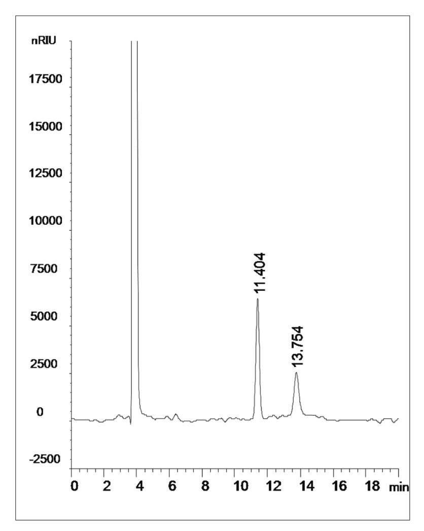 圖 1: Mercury NH2 色譜柱乳糖及蔗糖標(biāo)準(zhǔn)品測(cè)試圖譜
