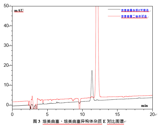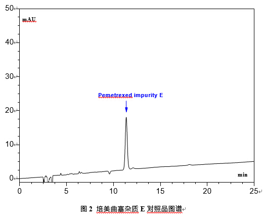 進樣體積:20 μL(供試品中培美曲塞濃度 0.24 mg/mL,異構(gòu)體雜質(zhì) E 濃度 0.16 μg/mL)