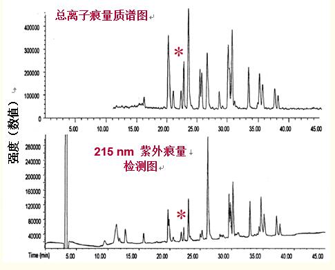 事實(shí)上,采用紫外檢測(cè)出現(xiàn)的小峰在質(zhì)譜圖中會(huì)更明顯(見(jiàn)圖26“*”)。