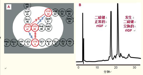 天然類胰島素生長(zhǎng)因子(IGF)的Cys52和Cys47以及Cys48和Cys6之間都有二硫鍵(圖43A紅色部分所示)。