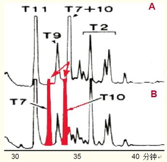 圖44A中,以T7+T10標(biāo)記出的肽是一種二硫鍵合的二肽。