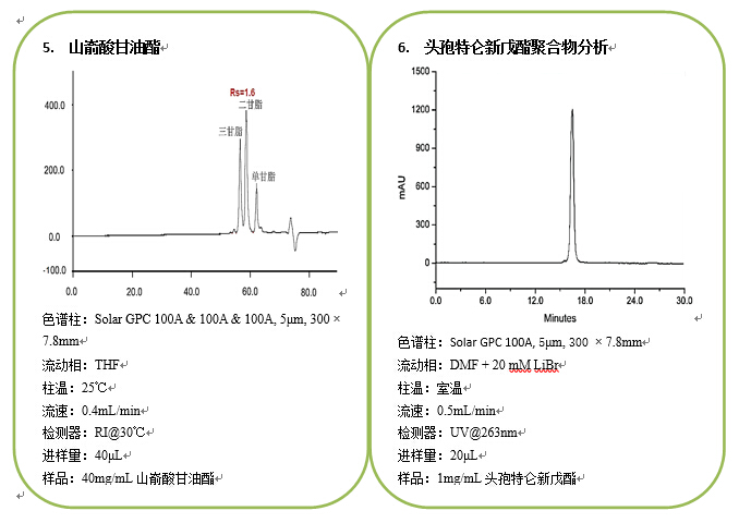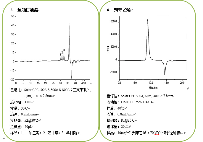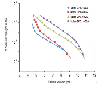• Solar系列脂溶性GPC/SEC色譜柱 Solar系列體積排阻色譜柱,以高交聯(lián)度的聚苯乙烯/二乙烯苯(PS/DVB)顆粒為基質(zhì),具有極窄的粒徑和孔徑分布,使分析中保留時(shí)間與分子量具有準(zhǔn)確的線性關(guān)系。高交聯(lián)度的多孔顆粒具有優(yōu)異的化學(xué)和物理穩(wěn)定性,因此在更換有機(jī)溶劑時(shí)可以使分子量校正曲線的形狀和色譜柱的柱效幾乎保持不變。